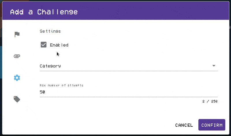 Once you have navigated to the advanced settings of a challenge, you will then be able to create a new category by simply typing in your desired category name in the category field and clicking the "CONFIRM" button. In the example below, we will be adding a category titled "New Category".