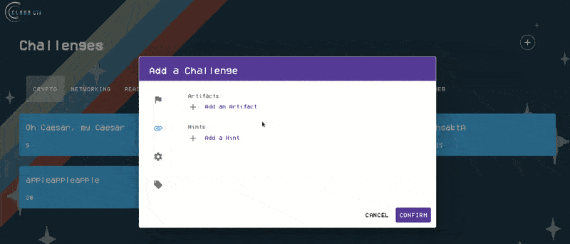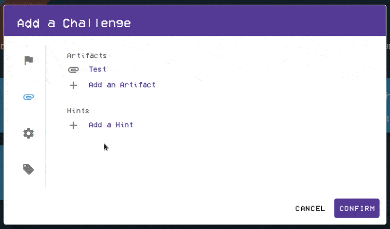 Once you have clicked on the Artifacts and Hints icon, please click on Add an Artifact and then select your artifact type. This can be either a file or a web link. Next, please supply a name for the artifact and then add a file or web link to the challenge. After you are finished, please click on confirm to add the artifact to your challenge.