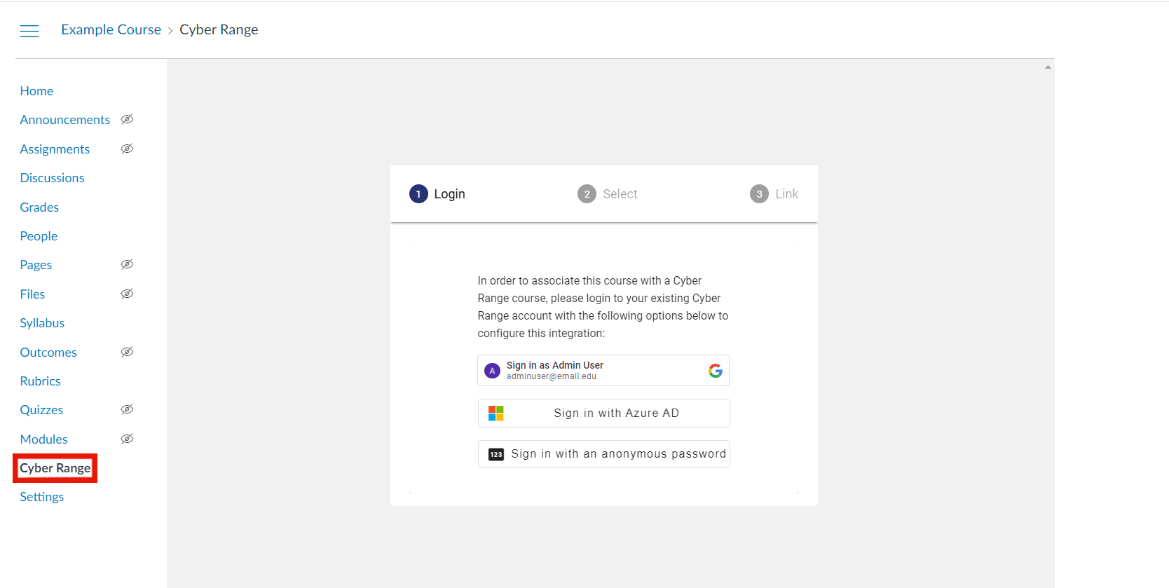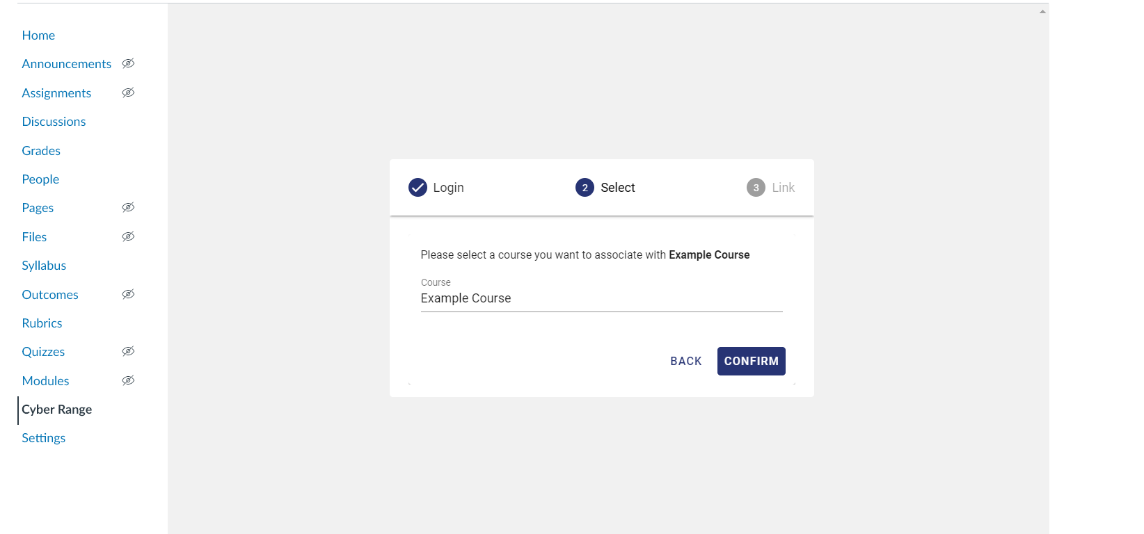 - After logging in, you will be presented with a drop-down box that includes all of your Cyber Range courses. Select the course you want to link.
