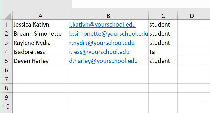 Replace the sample data with your own users' data. The first column is used to provide names for your users, the second column is used to provide email addresses, and the third column is used to provide the user's role.